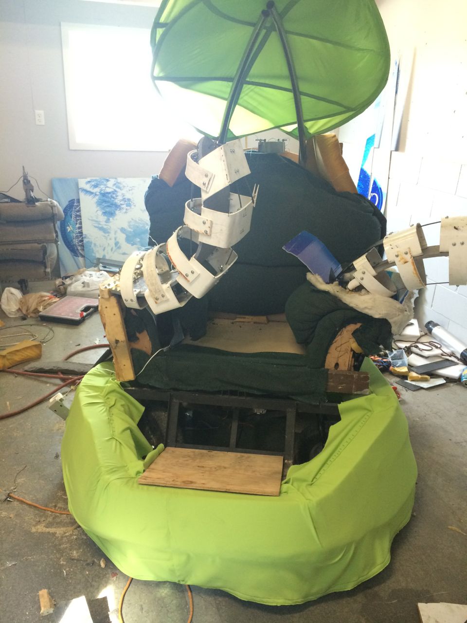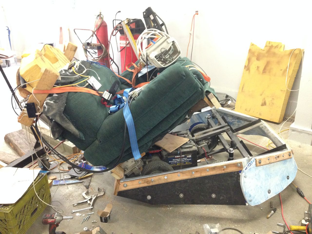 Testing out the cameras (raspberry pi based), as well as the two-way audio (asterisk PBX in the chair). The wheelie-bar is under the back skirt here too.